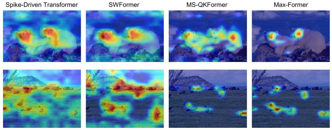 在ImageNet上,Max-Former-10-768(4时间步)取得了82.39%的Top-1准确率,以更少的参数量(63.99Mvs66.34M)大幅超越Spikformer达7.58%。