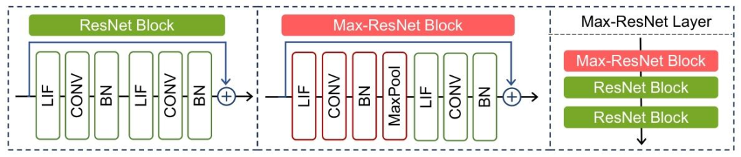 为了证明高频信息对SNN的重要性并非Transformer架构特有,研究者将这一洞察延伸到经典的卷积架构中,提出了Max-ResNet。