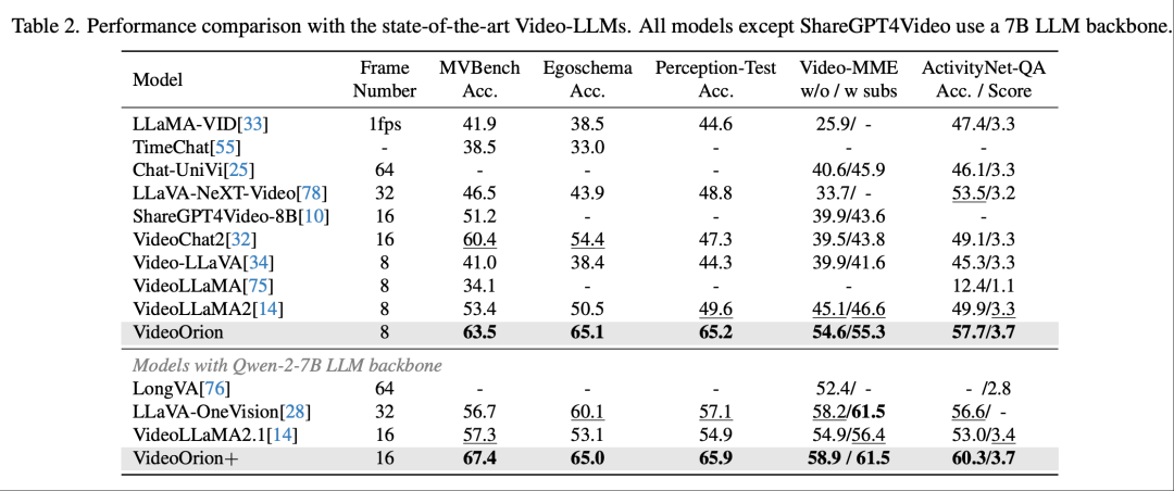 进一步看表格数值:在7B LLM设置下,VideoOrion在 MVBench/EgoSchema/Perception-Test/VideoMME(w/o/w subs)/ActivityNet-QA(Acc/Score)达到63.5 / 65.1 / 65.2 / 54.6–55.3 / 57.7–3.7,相对多款开源/闭源同规模模型具有明显优势。