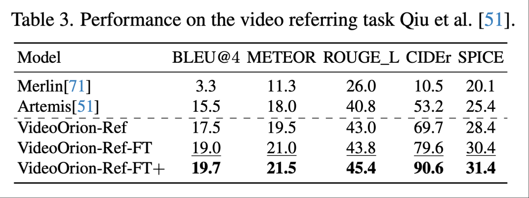 团队在VideoRef45K上对比Artemis、Merlin等方法,零样本即有效,经小规模指代数据微调后(3 epoch)多项指标(BLEU@4、METEOR、ROUGE_L、CIDEr、SPICE)全面领先,验证Object Token对指代理解的直接助益。