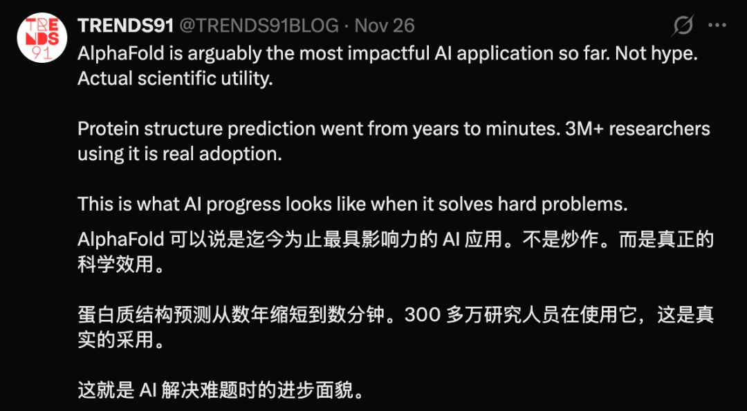 AlphaFold的出现,标志着生物化学领域正式向AI智能发展,也让哈萨比斯和John Jumper获得了2024年的诺贝尔化学奖。