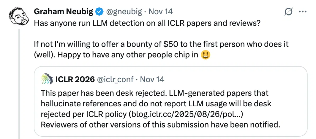 Graham Neubig自己干不了这个事儿,就在𝕏上发布了一个悬赏令,希望有人能做一轮系统性的检测,看ICLR的论文和审稿中到底夹杂了多少AI文本。