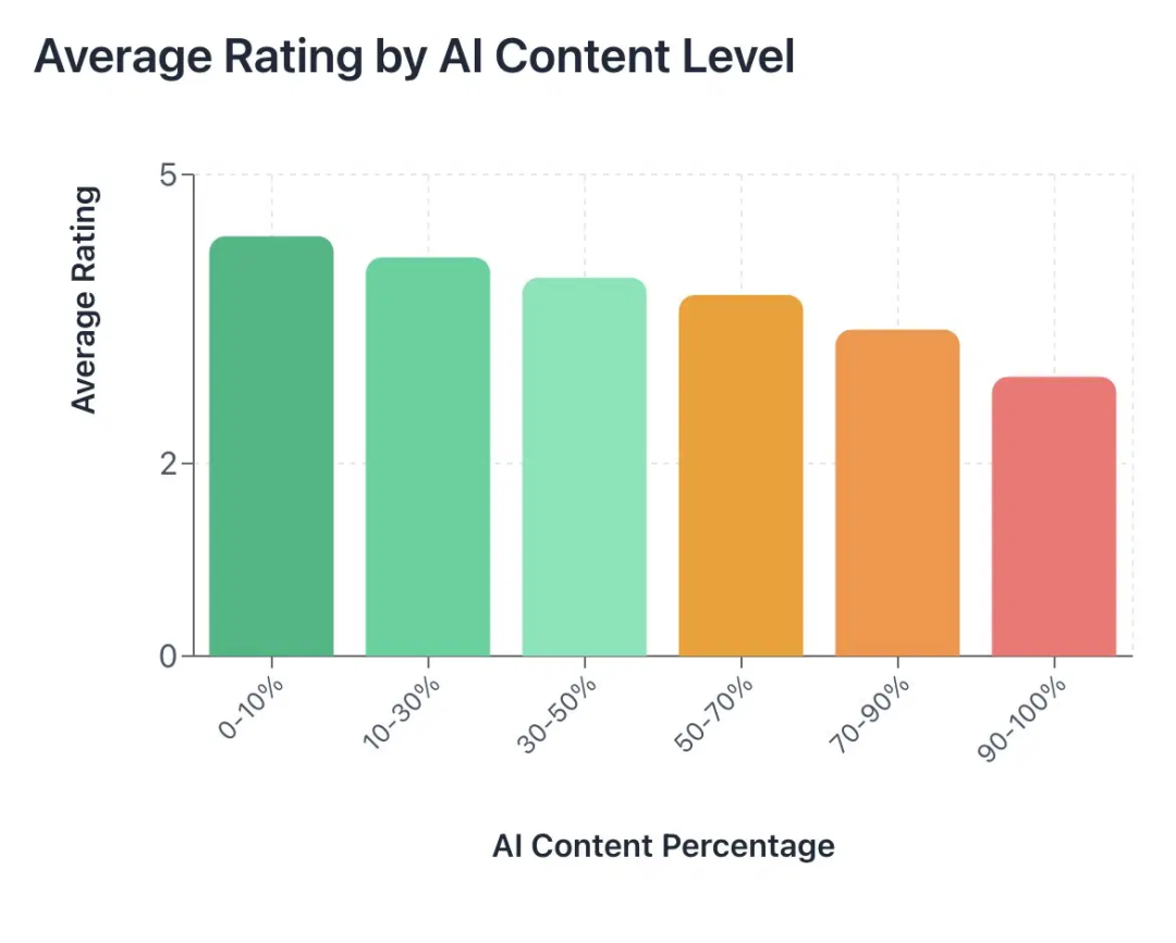 第一,论文中AI内容越多,平均收到的审稿评分就越低。