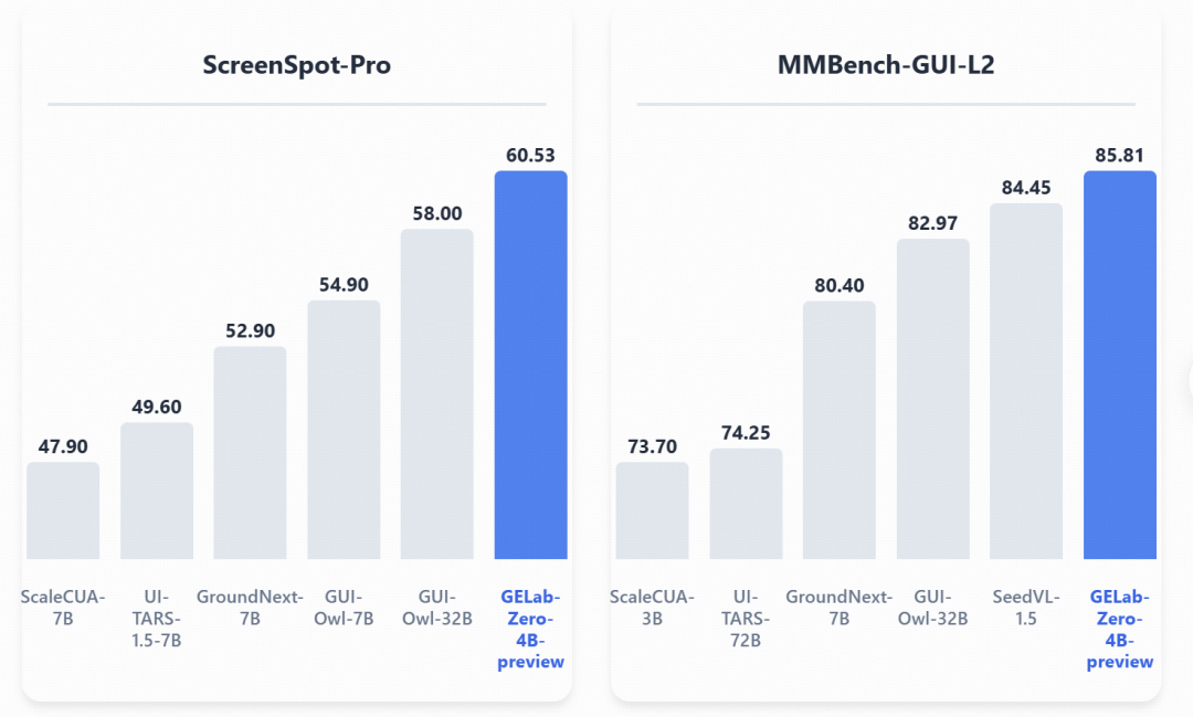值得一提的是,GELab-Zero-4B-preview的表现还超越了参数量更大的GUI-Owl-32B等模型,性能更优,也更易部署。
