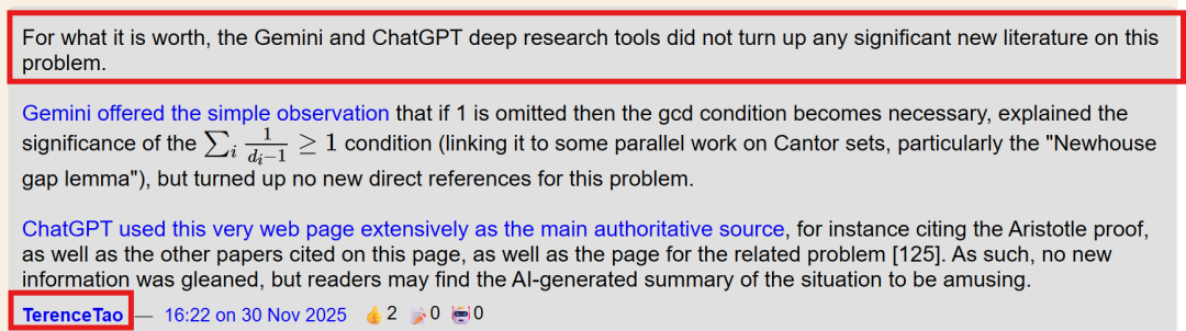 甚至连陶哲轩这样的顶尖数学家也跑来围观讨论,他在对比了Gemini和ChatGPT的深度研究工具后发现,Harmonic模型对该问题的证明表现更佳。