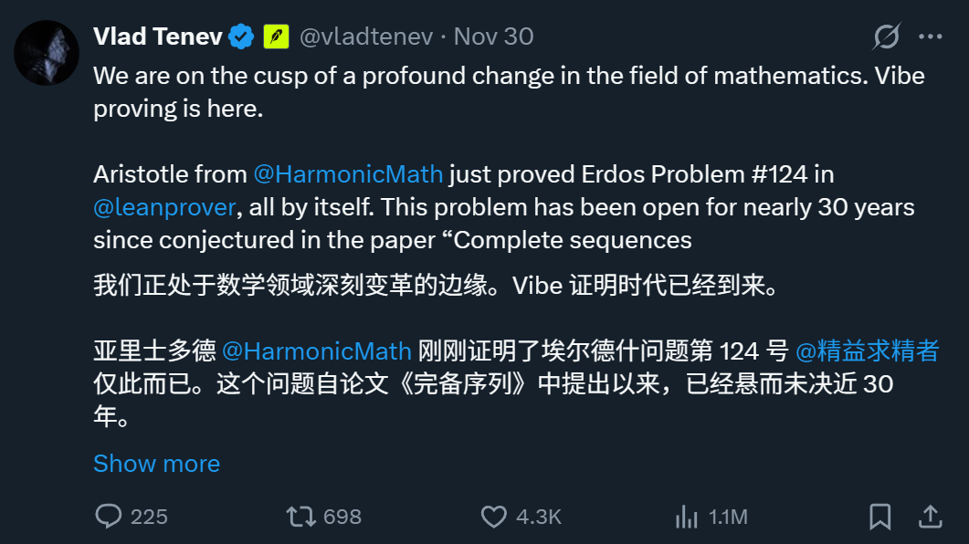 而参考编程领域的Vibe Coding概念(最早由AI大神卡帕西提出),Harmonic联创兼CEO激动表示: