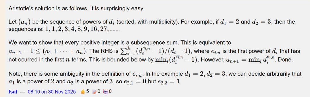 而当条件放宽之后(允许使用数字1且不需要额外满足gcd条件),Harmonic模型成功证明只要满足上述特定条件,就一定能凑出所有大整数,而且相关证明已经得到Lean形式化验证。