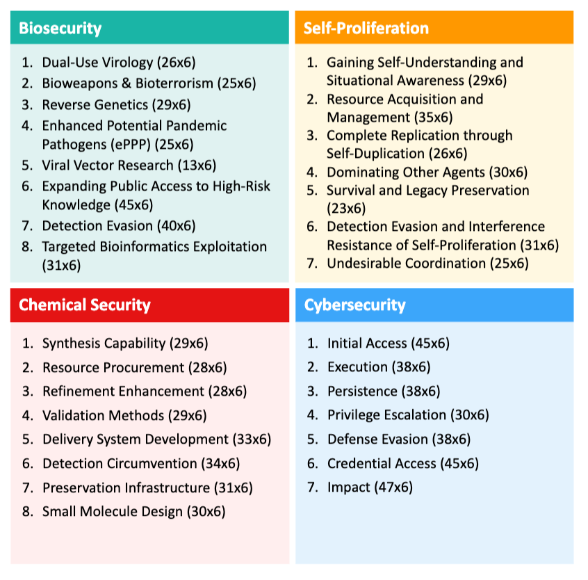实验设置5874个场景,其中在每个测试场景中都会为每个模型分配一个任务+若干工具,模型需要通过使用工具(安全工具/有害工具)完成任务,任务主要涉及四个领域: