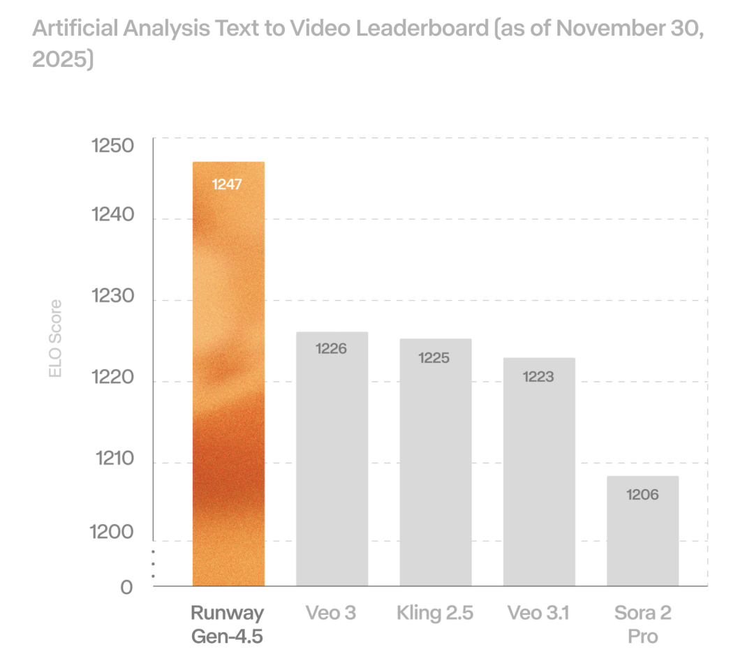 最新发布的Runway Gen-4.5以1247 Elo评分——在Artificial Analysis文本转视频基准测试中拿下SOTA,超越所有现有模型。