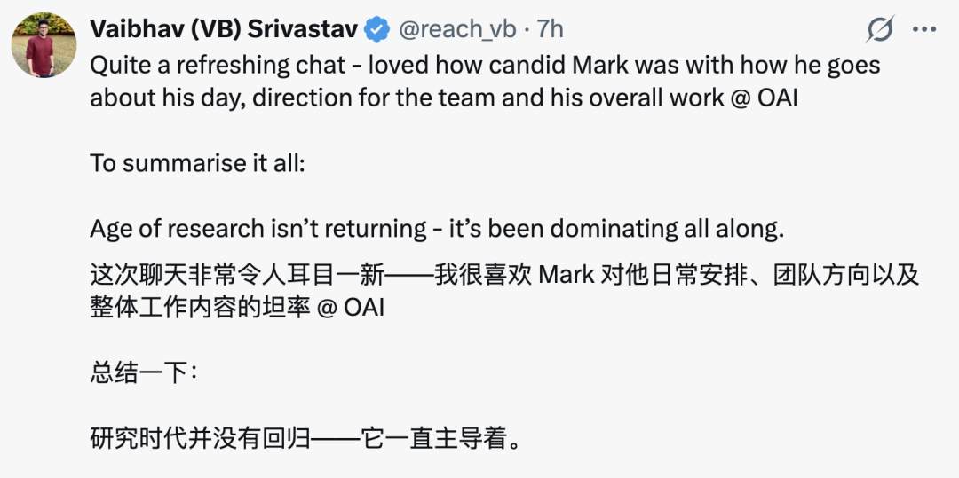 Mark Chen:34,快35了。老实说,没有。过去两周每天都是工作到凌晨1–2点。但我很喜欢这样,有很多事要做、很多人要招、很多方向要推动。如果我们正处在下一次工业革命里,那为什么不把握这个黄金时刻?