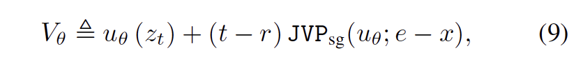 具体来说,iMF让用于计算复合预测函数V(代表对瞬时速度的预测)中,雅可比向量积(JVP)项所需的切向量输入不再是外部的e-x,而是由网络自身预测的边缘速度。