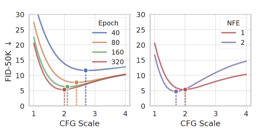 原始MeanFlow框架的一大局限是:为了支持单步生成,无分类器指导(CFG)的指导尺度在训练时必须被固定,这极大地限制了在推理时通过调整尺度来优化图像质量或多样性的能力。