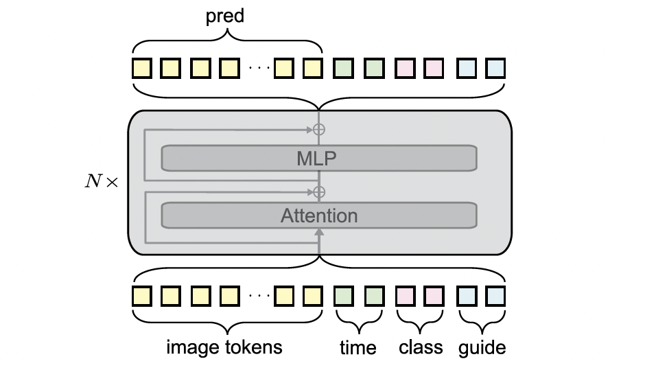 它的创新点在于:它将所有条件(包括时间步、类别以及 CFG 因子等)编码成多个可学习的Token(而非单一向量),并将这些条件Token直接沿序列轴与图像潜在空间的Token进行拼接,然后一起输入到 Transformer 块中进行联合处理。