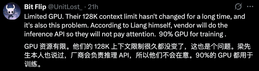另外,也有网友指出,DeepSeek的128K上下文已经很久没动了。这与GPU资源有限也不无关系。