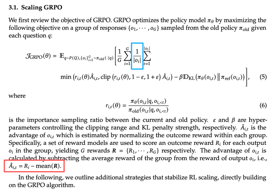 GRPO会根据“同一批题的得分标准差”调整权重。比如一道题所有人都做对(标准差小),或所有人都做错(标准差也小),这道题会被当成 “重点” 反复训练;而中等难度、有人对有人错的题(标准差大),反而被忽略。但实际训练中,中等难度的题才是提升能力的关键。