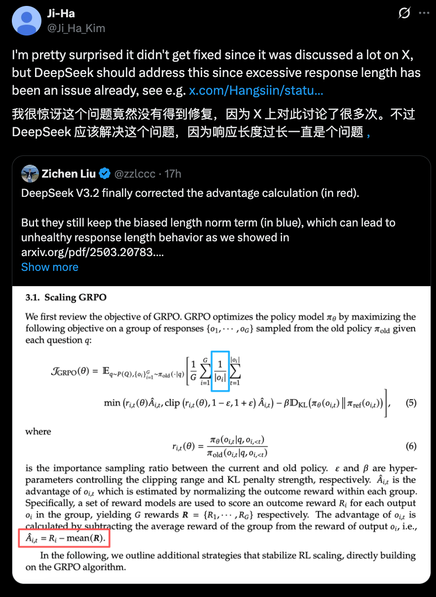 这项研究的核心作者Zichen Liu指出,DeepSeek-V3.2已经通过新的优势值计算方式,修正了“难度偏见”(如下图红框所示)。