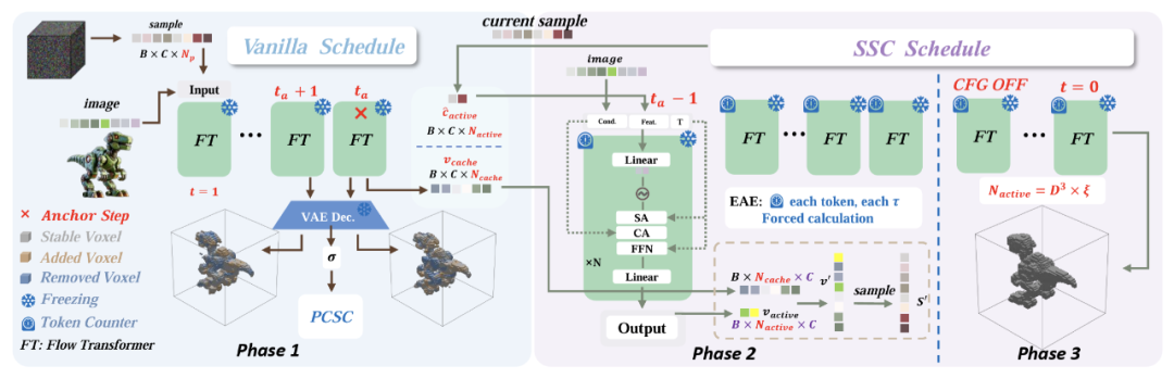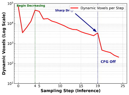 既然体素的稳定过程是有规律的,我们就可以“预判”!PCSC(Predictive Caching Scheduler Constraint)模块通过在早期的锚点步骤进行一次校准,就能画出一条“衰减曲线”,精准预测后续每一步有多少体素是稳定的。它动态地分配每一部的“计算预算”——变化大的时候多算点,稳定的时候多存点,绝不浪费一度电,也绝不错过一个细节。