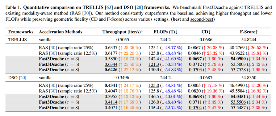 Fast3Dcache同时实现了提高几何生成速度,减少计算量以及保持高质量。在TRELLIS和DSO框架上的测试显示,Fast3Dcache在保证几何质量的前提下,显著提升了推理吞吐量。当参数τ=8时,模型提速27.12%,计算量(FLOPs)降低54.83%,如论文中表1所示。