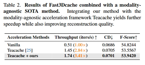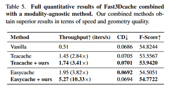 更重要的是,Fast3Dcache具有正交性,可以与现有的视频/图像加速算法(如TeaCache, EasyCache)无缝叠加,如论文中表2所示,Fast3Dcache + TeaCache推理速度为原来的3.41倍。此外作者在附录中补充了实验,如论文中表5所示,作者验证了Fast3Dcache + EasyCache推理速度提升更快,是原来的10.33倍!