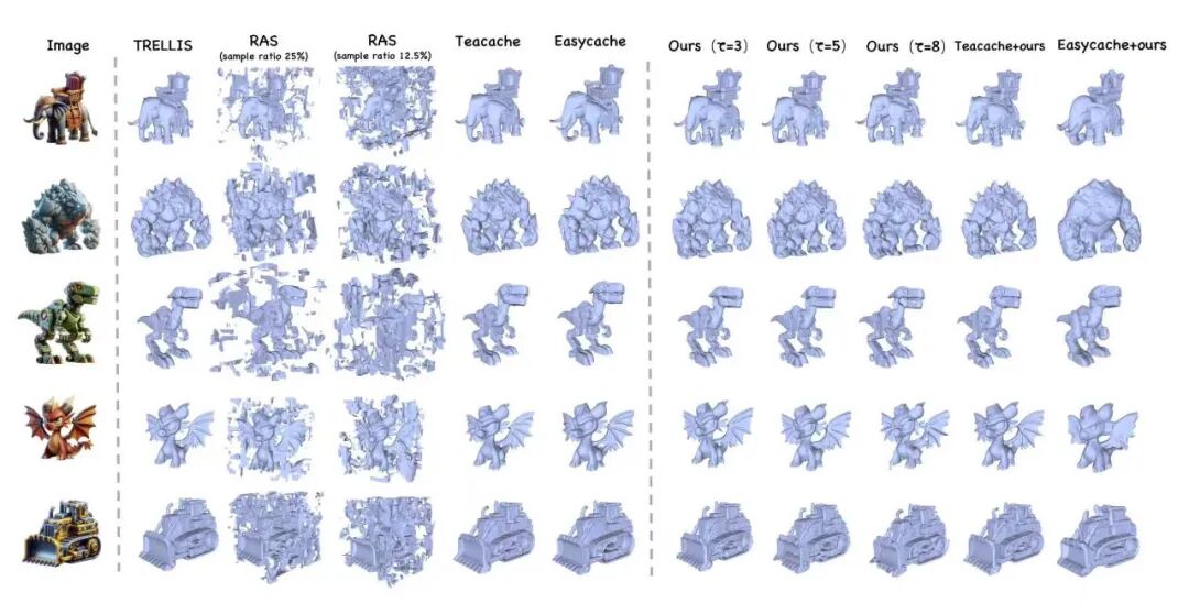为了加速,人们通常会想到在2D视频生成中大杀四方的“缓存(Caching)”技术——复用上一步的计算结果,跳过重复劳动。但在3D领域,直接照搬这套逻辑却翻车了:2D画面里的一点像素误差可能只是噪点,但在3D结构里,一点误差就会导致模型出现破洞、面片错位,甚至结构崩塌。