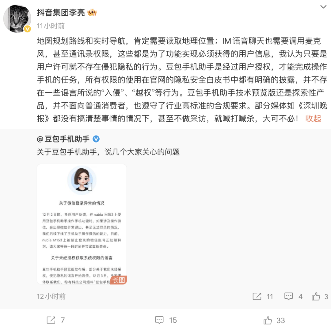 抖音集团副总裁李亮也发微博辟谣,他表示: