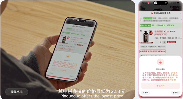 完成比价后,它会告诉你哪个平台最便宜,并在涉及付款等高敏感操作前,提醒你手动接管手机完成支付:
