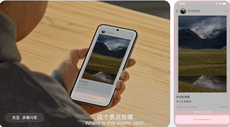 例如,在看到网友在社交平台发布的一张风景照时,按下AI键就能询问照片拍摄于哪里、视角来自哪个方向: