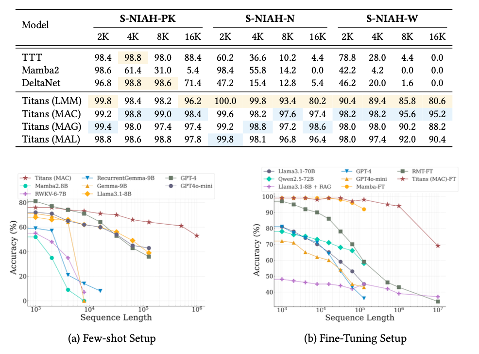 实验表明,Titans的MAC变体能够有效将上下文窗口扩展到200万,并在“大海捞针”任务中保持高准确率。