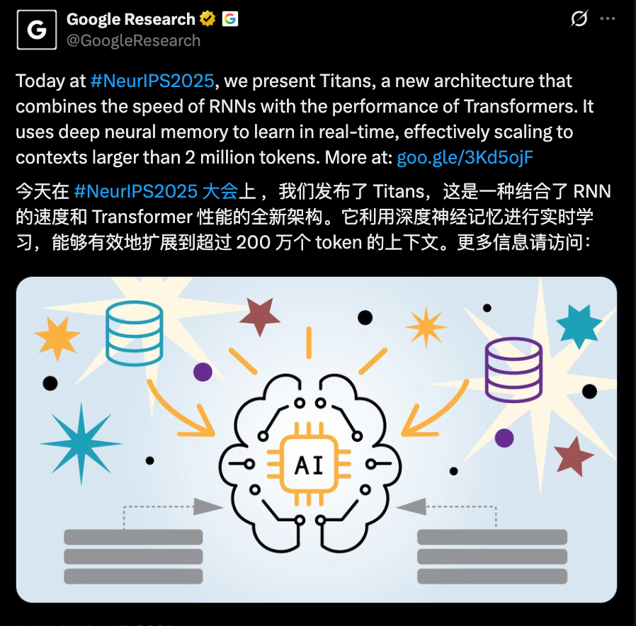 Titans + MIRAS,是谷歌提出的新架构和理论蓝图,目的是将RNN的速度和Transformer的性能结合到一起。