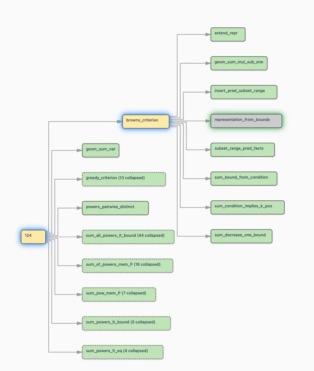 其中#124是一个30年前的加法数论问题,涉及将整数表示为多个进制下的幂之和,在Axiom发布的前两天,Harmonic同样宣称解决了该问题,但只完成了简化版问题的证明,以及Lean形式化验证。