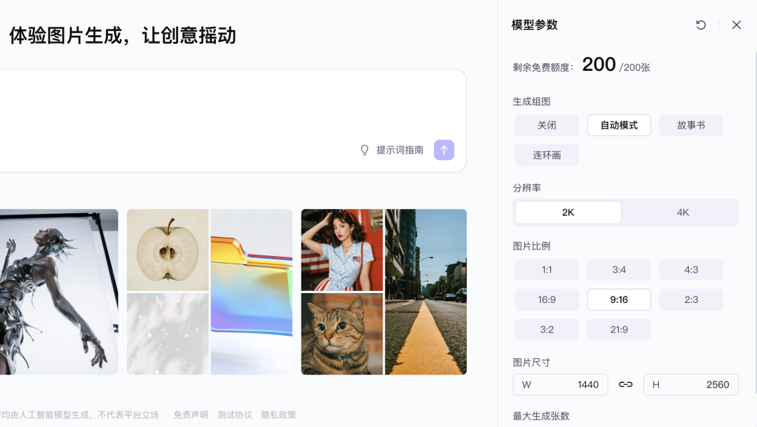用户可在输入框中选择开启生成组图,有自动模式/故事书/连环画三种模式可选。生图分辨率支持2K、4K。图片比例、尺寸、最大生成张数(单次最多生成15张)等参数也能调整。
