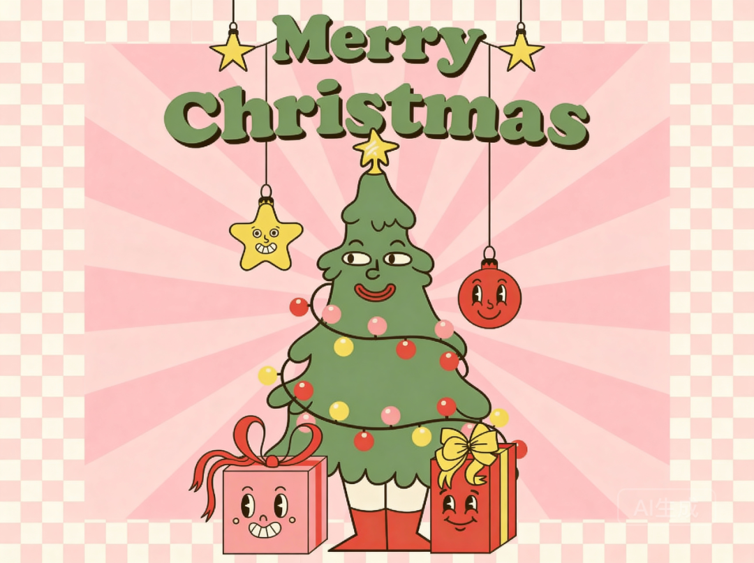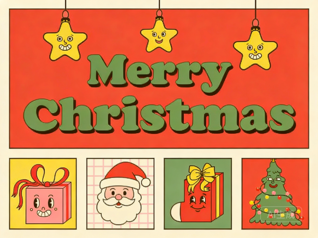 将几张图中元素融合到一张图中生成一张圣诞海报,画面主体是一颗大圣诞树,圣诞树下面摆放着礼物,海报上方写着“Merry Christmas”,字上要挂上小星星、气球装饰。