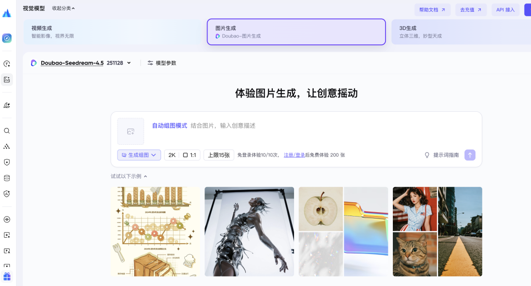 在火山引擎AI体验中心即可试用最新模型,注册登录后可免费生成200张。