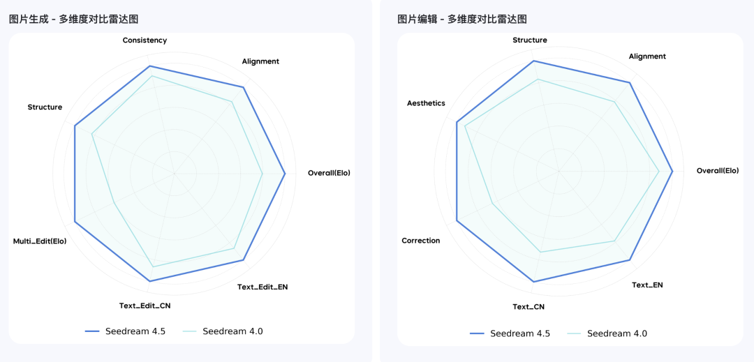 在内部多维度基准测试MagicBench上,Seedream 4.5与上一代Seedream 4.0相比,在指令遵循、一致性、美学表现等多个维度表现全面提升。