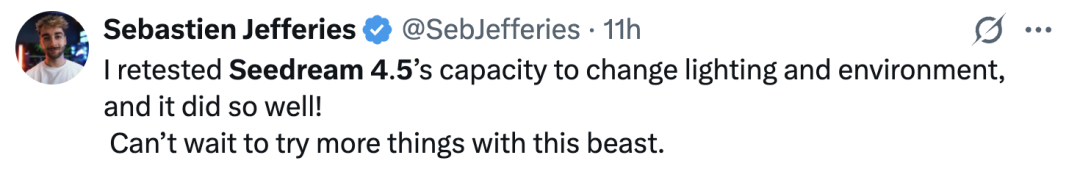 有网友反馈Seedream 4.5的光影与环境调整能力表现十分出色:
