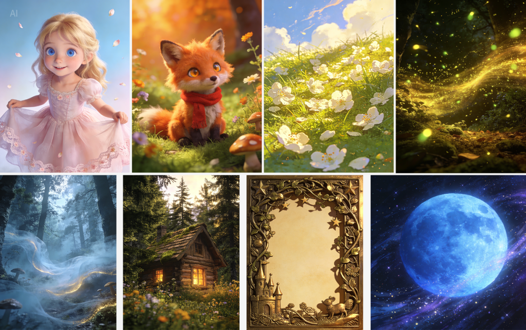 在官方展示中,输入8张参考图,并指定画面布局后,让它生成图画故事书封面: