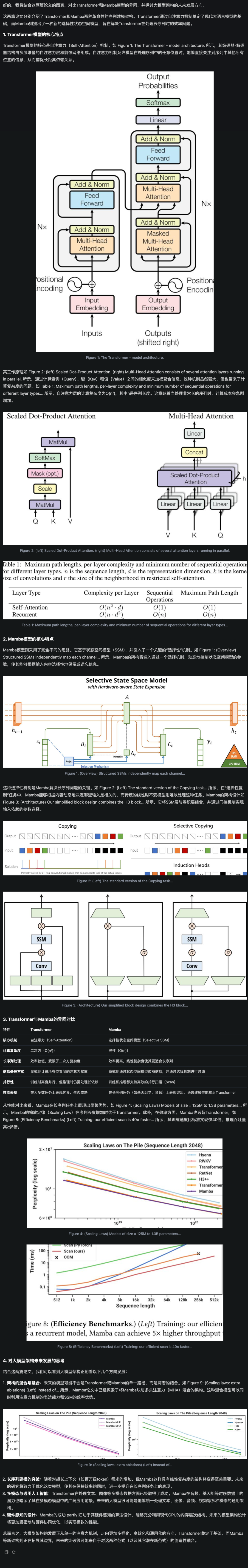 结合这两篇论文的图表,对比一下Transformer和Mamba模型的异同,并帮我思考一下大模型架构下一步该如何发展?