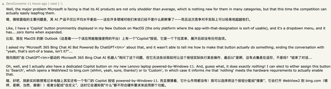 而且他们的AI策略也更倾向于提供便宜但性能一般的低成本产品,所以也导致微软的AI产品市场反响不够强烈。