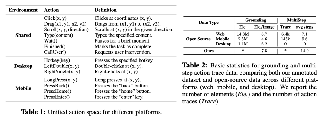 2)设计跨平台统一动作空间,整合标注轨迹与开源数据提升动作定位准确性。