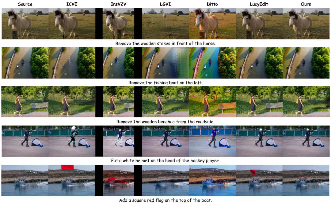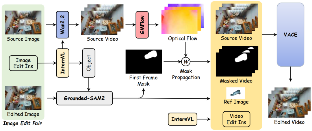 d. 最后,基于得到的掩码流、源视频以及文本指令,用VACE进行视频内填充生成编辑后视频Vt,该步骤既保证了被编辑区域的语义变化(对象移除或插入),又维护了背景与运动的全局一致性。