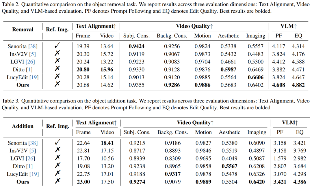 无论是对象移除还是对象添加任务,LoVoRA都在大多数指标上取得最佳或次优结果,体现出在语义一致性、对象级操作精度、背景稳定性与运动连续性上的显著优势。