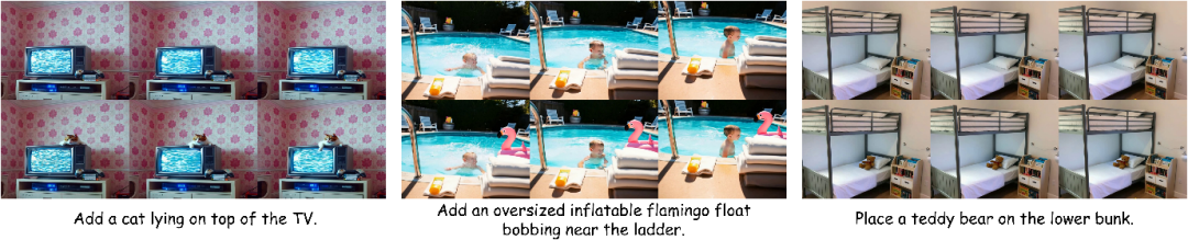 定性分析:从可视化结果中可以观察到LoVoRA在复杂场景下对对象的精准定位与自然编辑能力。对于移除任务,LoVoRA能够干净地擦除目标对象,几乎不留残影或结构性破坏,同时完整保留原有的纹理、光照与背景几何;