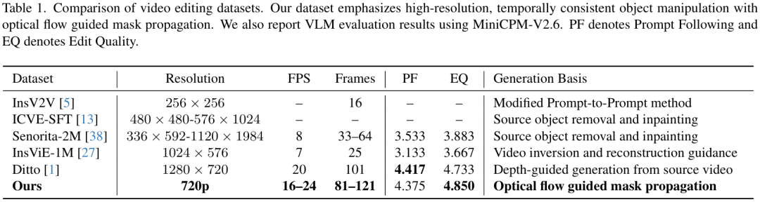 现有的基于指令的视频编辑数据集,例如InsViE, Ditto, Senoritia, ICVE-SFT等,具有显著先进的文本引导视频操作。