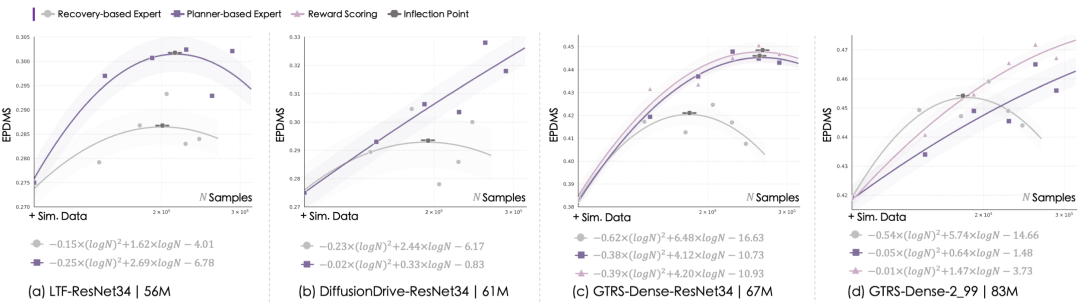 SimScale首次系统揭示了仿真数据对端到端规划模型性能的规模效应,通过拟合对数二次函数,建模总数据量(真实 + 仿真)与模型表现的关系,展示了在真实数据固定时,随着仿真数据量增加,模型在不同伪专家策略和规划器上的表现差异。