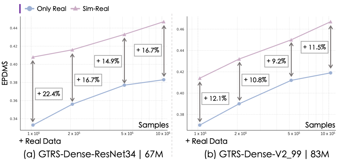 无需更多真实数据,只靠扩大仿真数量,一样能持续突破任何端到端驾驶模型的性能上限。