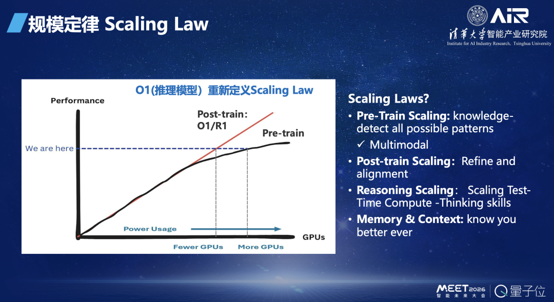这个图就特别清楚,规模定律可以看到的Pre-train还在往上走,但是走的速率已经在平缓,Post-train在increase,智能体还是直线地往上走。