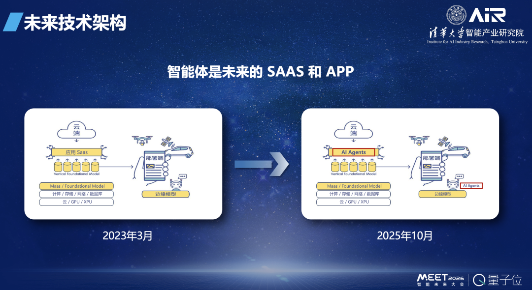 10月我把这个架构做了更新,最重要的一点就是我认为未来我们的SaaS和在设备端或边缘端的手机APP都会被Agent取代,也就是说智能体是未来的SaaS和APP。