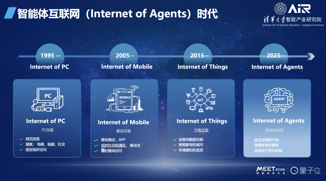 智能体互联网是未来5–10年最大方向,也是通往AGI的必经之路,预计在15–20年内完成从信息智能到物理智能、再到生物智能的跨越。
