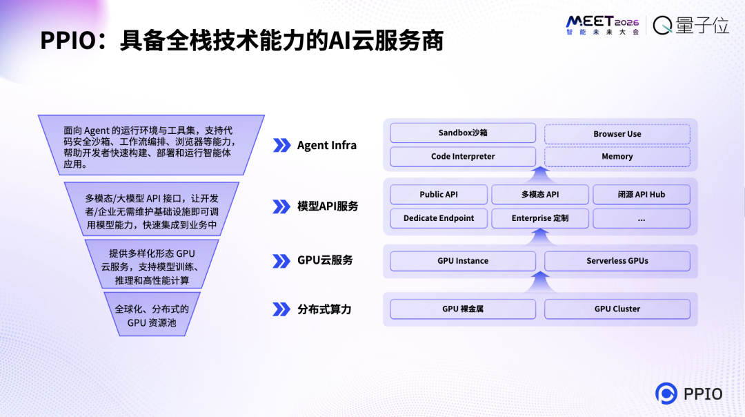 PPIO是一家AI云计算公司,我们从底层算力到IaaS、PaaS,再到MaaS,逐层构建了完整的AI云能力,为Agent Infra提供底座支撑。