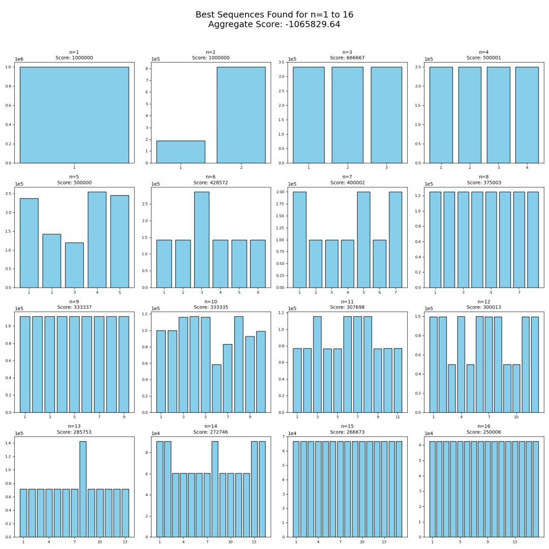 第二天,陶哲轩注意到了这个问题,他将该问题放入AlphaEvolve,要求它通过生成总和为固定值(这里选择的是10的6次方)的实数(或整数)序列,来获取c(n)的上界,并尽可能确保S的值够小。